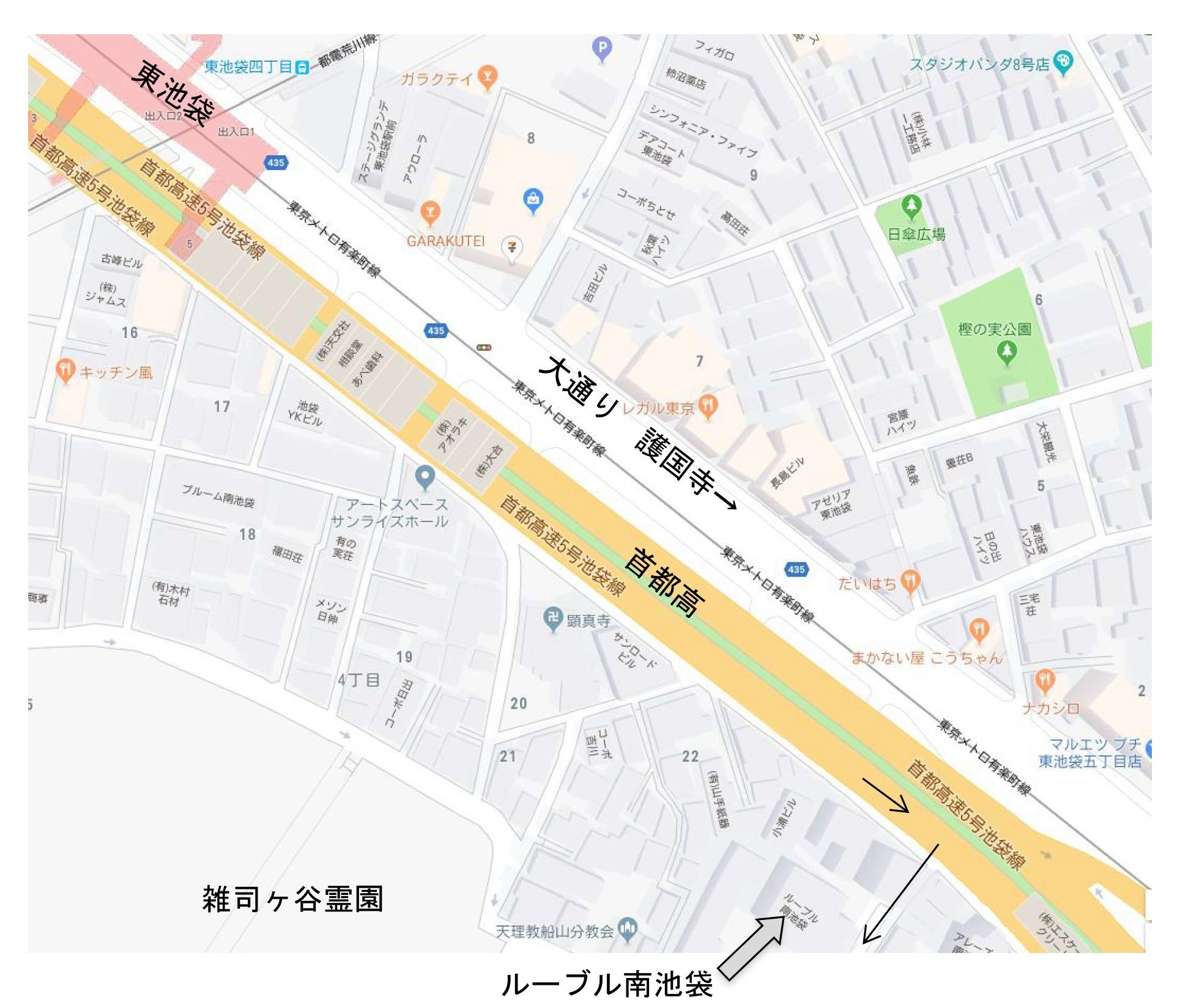アクセス ブレインリサーチ〒171-0022 東京都豊島区南池袋 4-22-19 ルーブル南池袋 608 有楽町線の東池袋駅下車(雑司が谷方面出口5番)、出口裏側の細い方の道(上は高速道路、平行に走る太い道路は池袋からのグリーン大通り)を池袋と反対方向に2~3分歩き、高速道路高架の柱の番号が[池-400]のところで路地を右へ。雑司ヶ谷霊園との間の茶色っぽいマンションです。(池袋から徒歩約15分)。608を呼び出して下さい(オートロック)。6階でエレベータを降り、右端です。